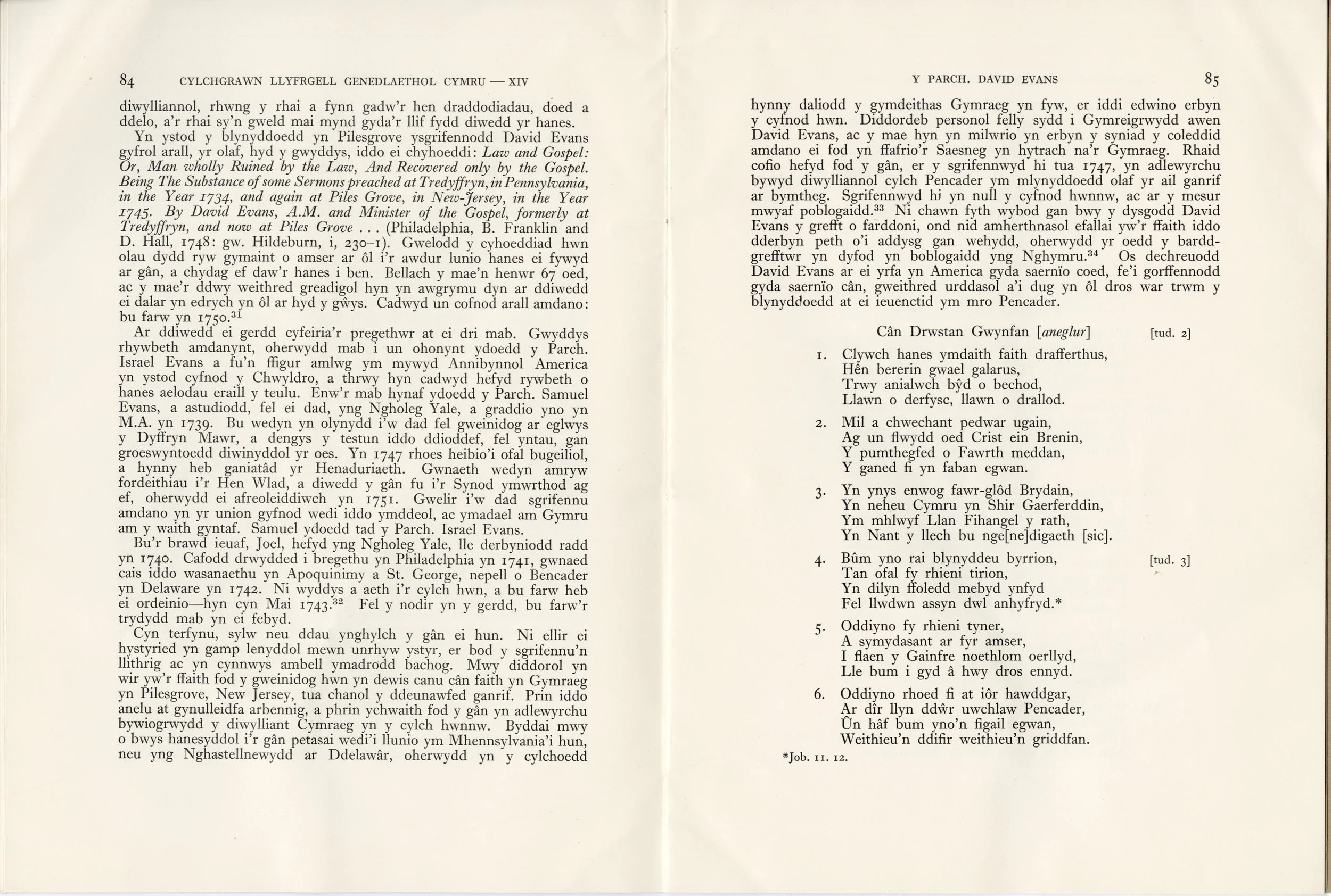 Davies, Gareth Alban. "Y Parch. David Evans, Pencader—Ymfudwr Cynnar I Pennsylvania." National Library of Wales Journal, vol. 14, no.1, 1965, pp.85-92.