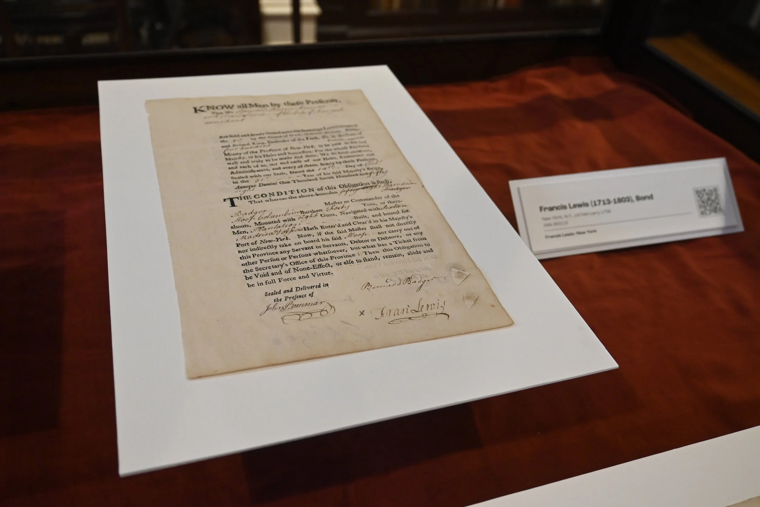 Francis Lewis was a wealthy merchant with an extensive network of contracts. Several weeks before the date of this document, he had petitioned to license his ship Columbine as a privateer, allowing it to attack enemy shipping during the French and Indian War. Now, as the ship is about to depart, Lewis and the ship's master, Barnard Badger, agree not to provide transportation to any servants, debtors, or other people without permission to leave the colony.